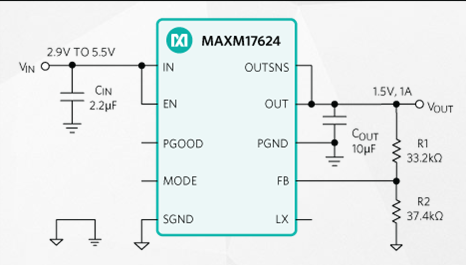 MAXM17623和MAXM17624模塊在穩(wěn)態(tài)工作時采用峰值電流模式控制方法。為降低輸入浪涌電流,器件提供1ms固定軟啟動時間。兩款模塊均可選擇輕載時采用PWM或PFM模式。選擇PWM模式時,MAXM17623工作在固定2MHz開關頻率,MAXM17624工作在固定4MHz開關頻率。MAXM17623提供0.8V至1.5V輸出電壓,MAXM17624提供1.5V至3.3V輸出電壓。